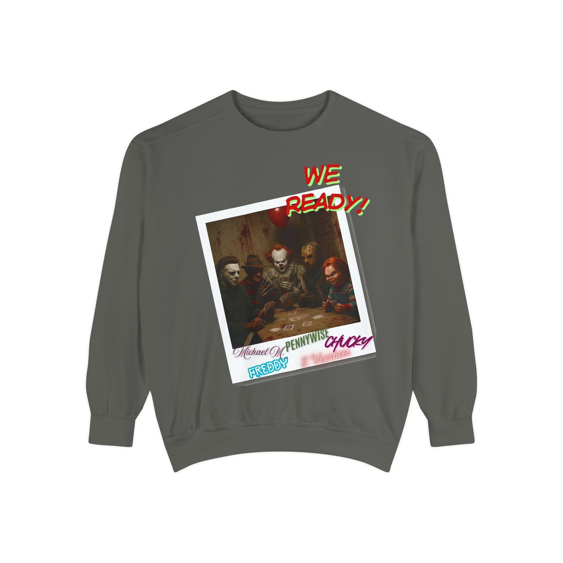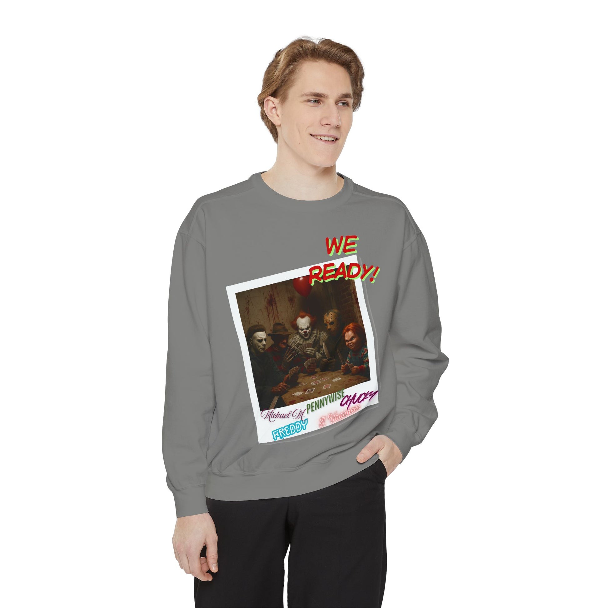 Horror Sweatshirt with 'WE READY!' Design, Cozy Garment-Dyed Pullover for Fans, Great for Halloween, Movie Nights, Holiday Gifting